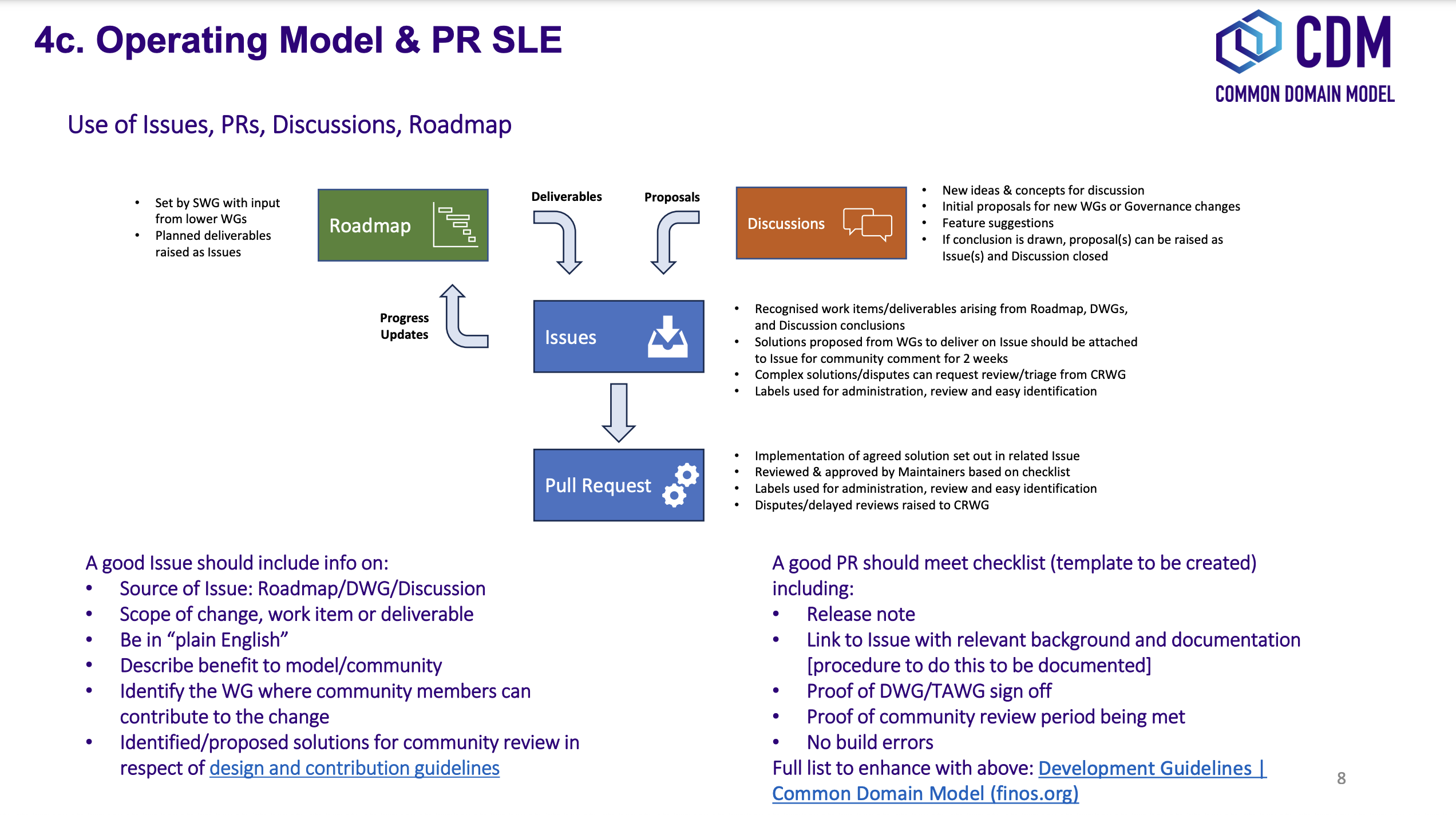 The CDM Development Guidelines are defined by the Steering Working Group. The full set of CDM development guidelines for how contributions are reviewed can be found here.